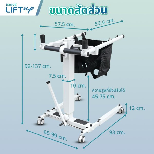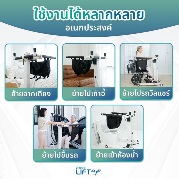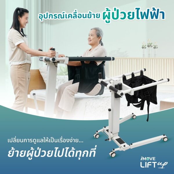 อุปกรณ์เคลื่อนย้ายผู้ป่วยระบบไฟฟ้า iMOVE LIFT UP คือโซลูชั่นที่ออกแบบมาเพื่อลดภาระและเพิ่มความปลอดภัยในการเคลื่อนย้ายผู้สูงอายุหรือผู้ป่วยที่มีปัญหาด้านการเคลื่อนไหว ออกแบบที่นั่งแบบใหม่มาให้ยกผู้ป่วยได้โดยง่าย โดยไม่ทำให้เจ็บก้นหรือเจ็บหลัง มีตัวควบคุม สามารถปรับความสูงที่นั่งขึ้น-ลงด้วยระบบไฟฟ้า ทำให้การย้ายผู้ป่วยจากเตียงไปยังรถเข็น, ห้องน้ำ, โซฟา หรือแม้กระทั่งรถยนต์ เป็นไปอย่างง่ายดาย, นุ่มนวล และลดความเสี่ยงต่อการบาดเจ็บของทั้งผู้ดูแลและผู้ป่วย