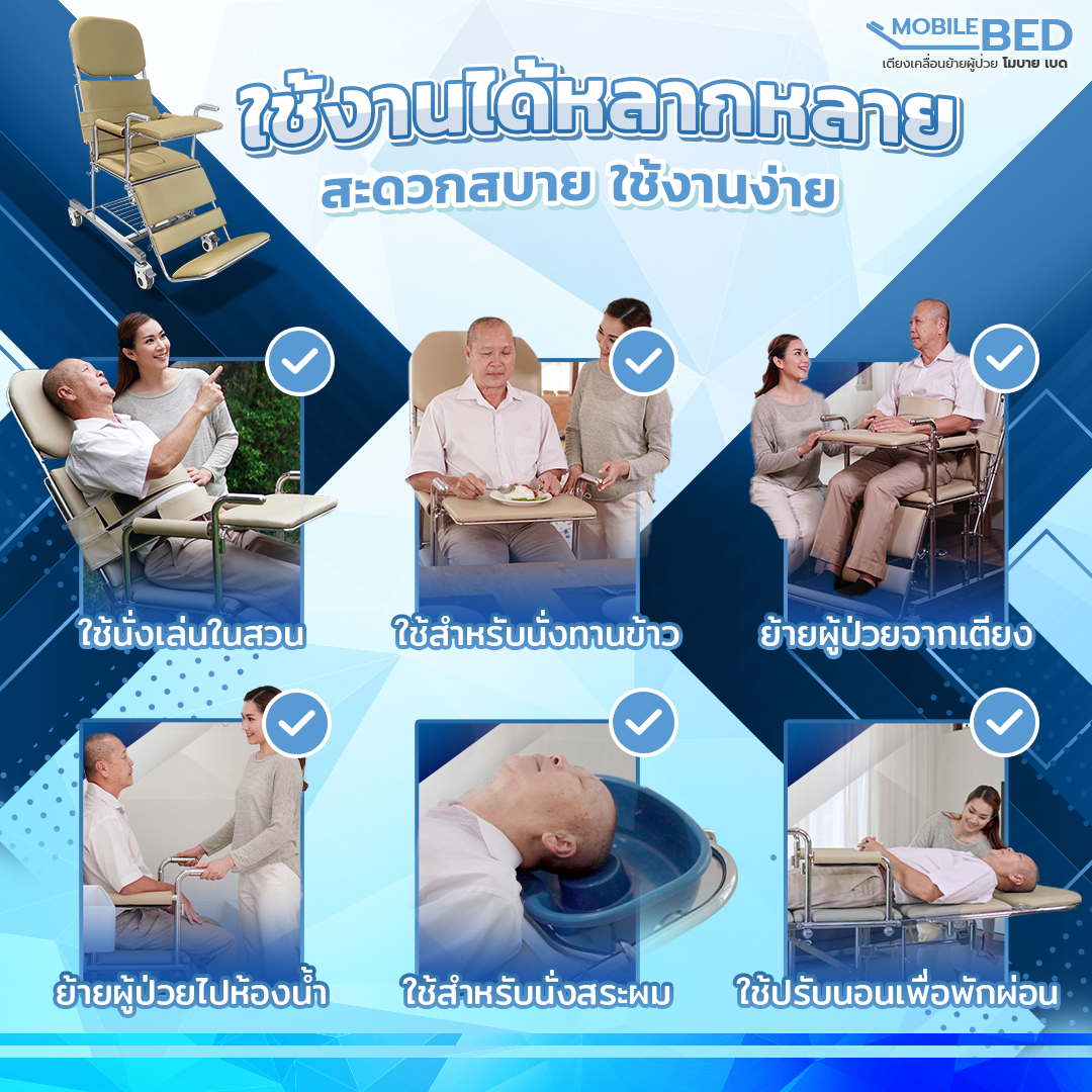 ใช้เคลื่อนย้ายผู้ป่วยจากเตียงไปอาบน้ำขับถ่าย และอื่นๆ เหมาะกับผู้ป่วยที่เคลื่อนไหวได้น้อย หรือ ติดเตียง